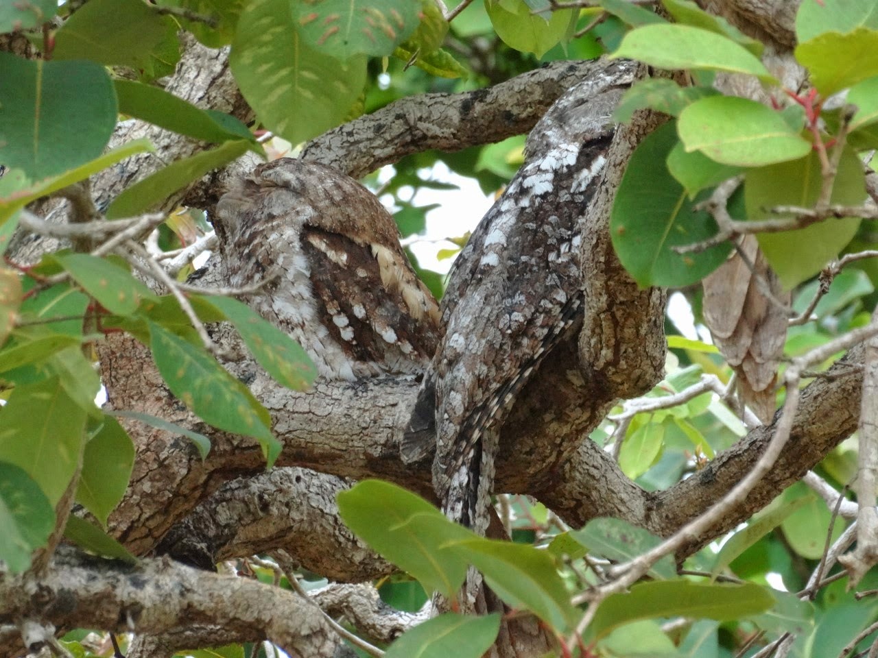 I was told of a family of roosting Papuan Frogmouth not far from the office of Loyalty Beach camp ground. Getting decent photos of them was difficult, as they sat close to & were mostly obstructed by branches of a similar colour for camouflage. This 1 is probably the female.