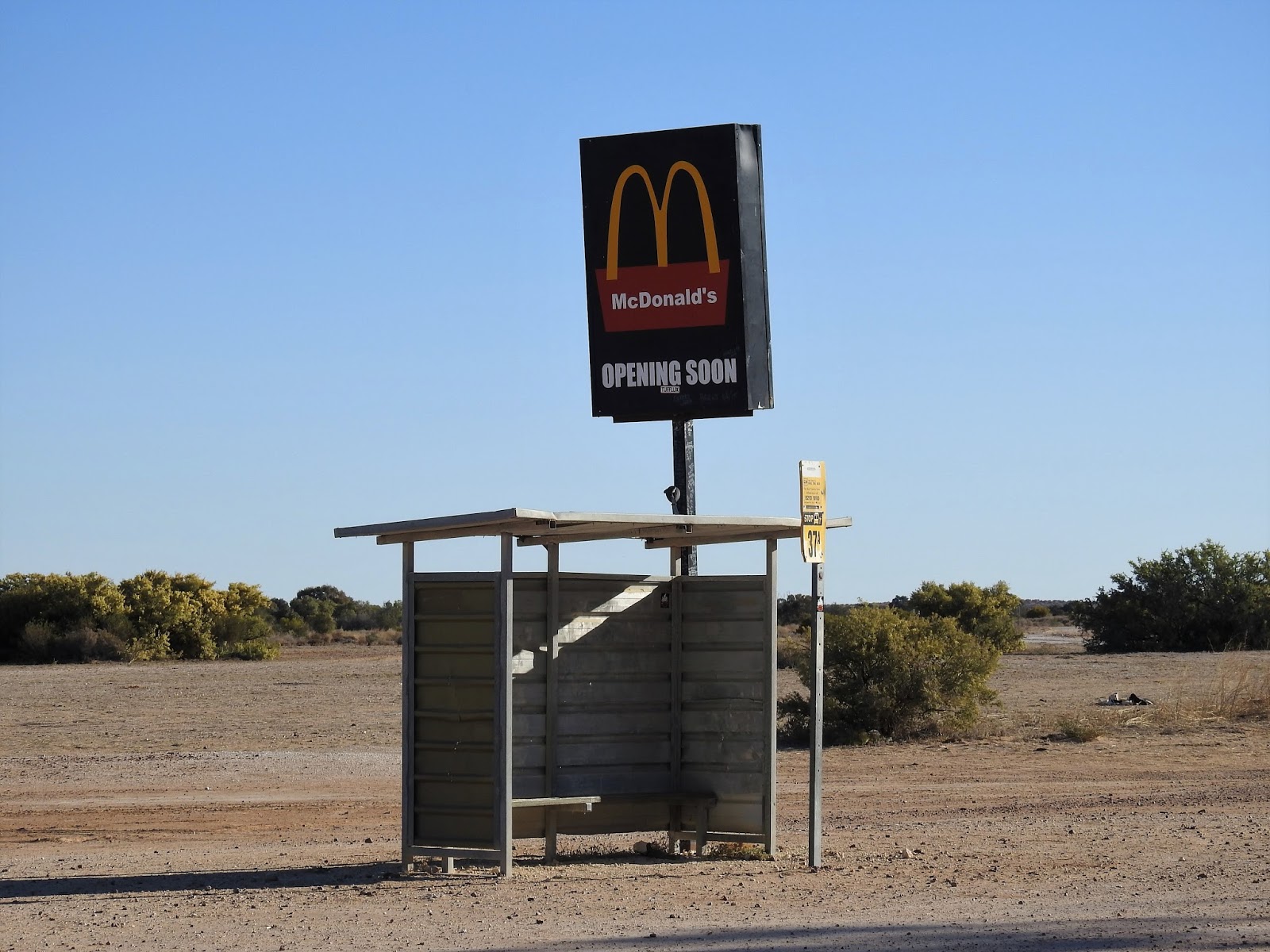 I love their outback humour as this is never going to happen. I'm also not sure if the bus stop actually is a real bus stop as there's only tour buses passing through.